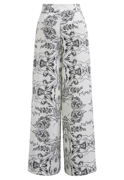 بنطلون أنيق بتصميم واسع (Wide-Leg) باللون الأبيض مع نقوش نباتية وزهرية باللون الأسود. مصنوع من قماش مريح وخفيف، مثالي لإطلالة يومية عصرية أو مناسبة خاصة، ويمكن تنسيقه مع بلوزة أو توب بسيط لإبراز النقشة.